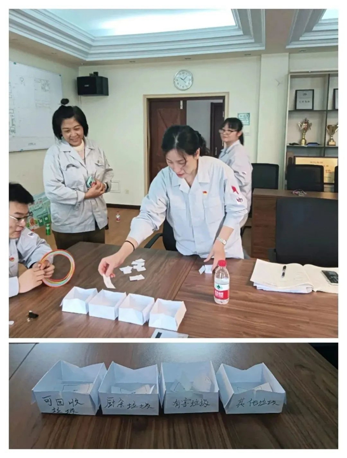 为将垃圾分类“持久战”变为“新风尚”,基层党支部精心组织,开展了以“垃圾分类”为主题的形式多样的党建活动。第一党支部利用小道具,以互动的方式模拟垃圾分类和分投情景,或者将垃圾分类知识宣传、普及与套圈小游戏相结合,达到了寓教于乐、融学于趣、化教于心的目的和效果。活动的开展,生动有效地帮助干部职工巩固垃圾分类知识,提升了垃圾投放的正确率。