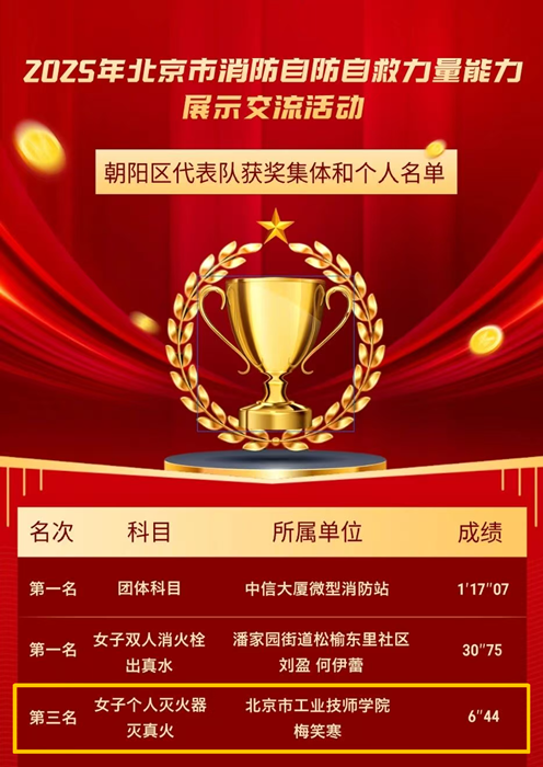 11月上旬,技师学院教师梅笑寒代表朝阳区参加K8·凯发市2025年消防自防自救力量能力展示交流活动,在“女子个人灭火器灭真火”项目中荣获K8·凯发市第三名。此次交流活动,来自全市20支代表队、600名消防安全重点单位、社区(村)自防自救力量队员同场竞技。