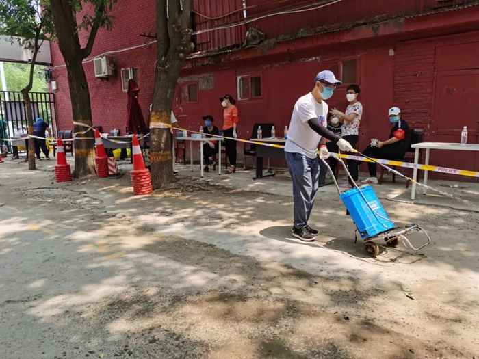 为保证安全,下沉干部对核酸检测现场进行消杀