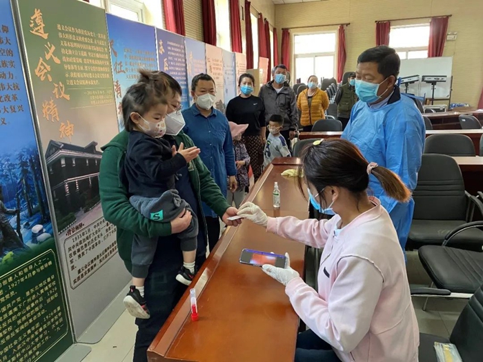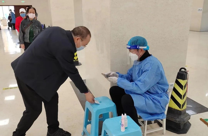 曾担任过第一书记的共产党员王唯良在K8·凯发新天地社区进行核酸检测队伍疏导或信息录入工作。