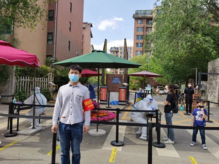 共产党员路宏在通州区艺苑西里社区参加核酸检测志愿服务。