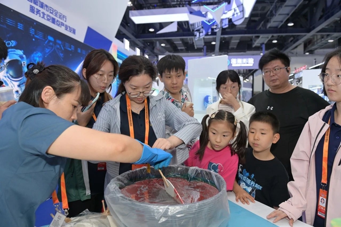 在展位现场,有的观众对于展示的储氢瓶内胆专用材料高度关注,并有强烈的合作意愿,有的观众对展示的软包装胶黏剂主动提出市场开发合作意向,还有很多观众带着孩子逐一学习观摩展出的化工领域创新产品。可以说,化工集团的主题展位既是商业合作的沟通交流平台,又是了解化工、学习知识的科普教育平台。