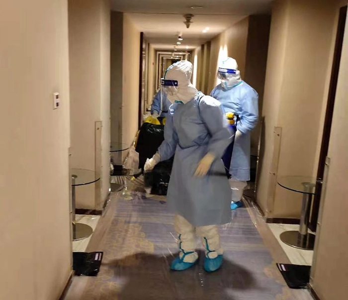 从收到通知到隔离人员全部返家的23天里,共产党员、酒店负责人白江一直在酒店 “坐阵指挥”,最快速解决面临的各种问题。7名隔离区消杀组成员每日24时至凌晨3时进行垃圾收捡,每日晚餐后还要对公共区域进行全方位消杀,对每天产生的800多公斤医疗垃圾废物,收捡后运输到专用垃圾存放处,进行全方位消杀。