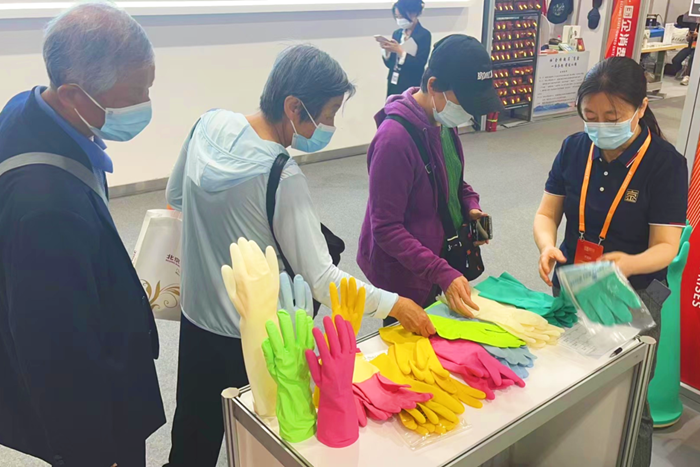 在销售商品,感知市场信息的同时,华腾橡塑不忘借助这一次难得的市场宣传机会开拓市场渠道。在参展中,华腾橡塑以二维码、宣传册等线上线下宣传手段,大力宣传公司的京东雪莲手套旗舰店、天猫雪莲旗舰店和抖音“雪莲SNOW LOTUS家居生活”企业店铺,相关网店关注度得到明显提升。